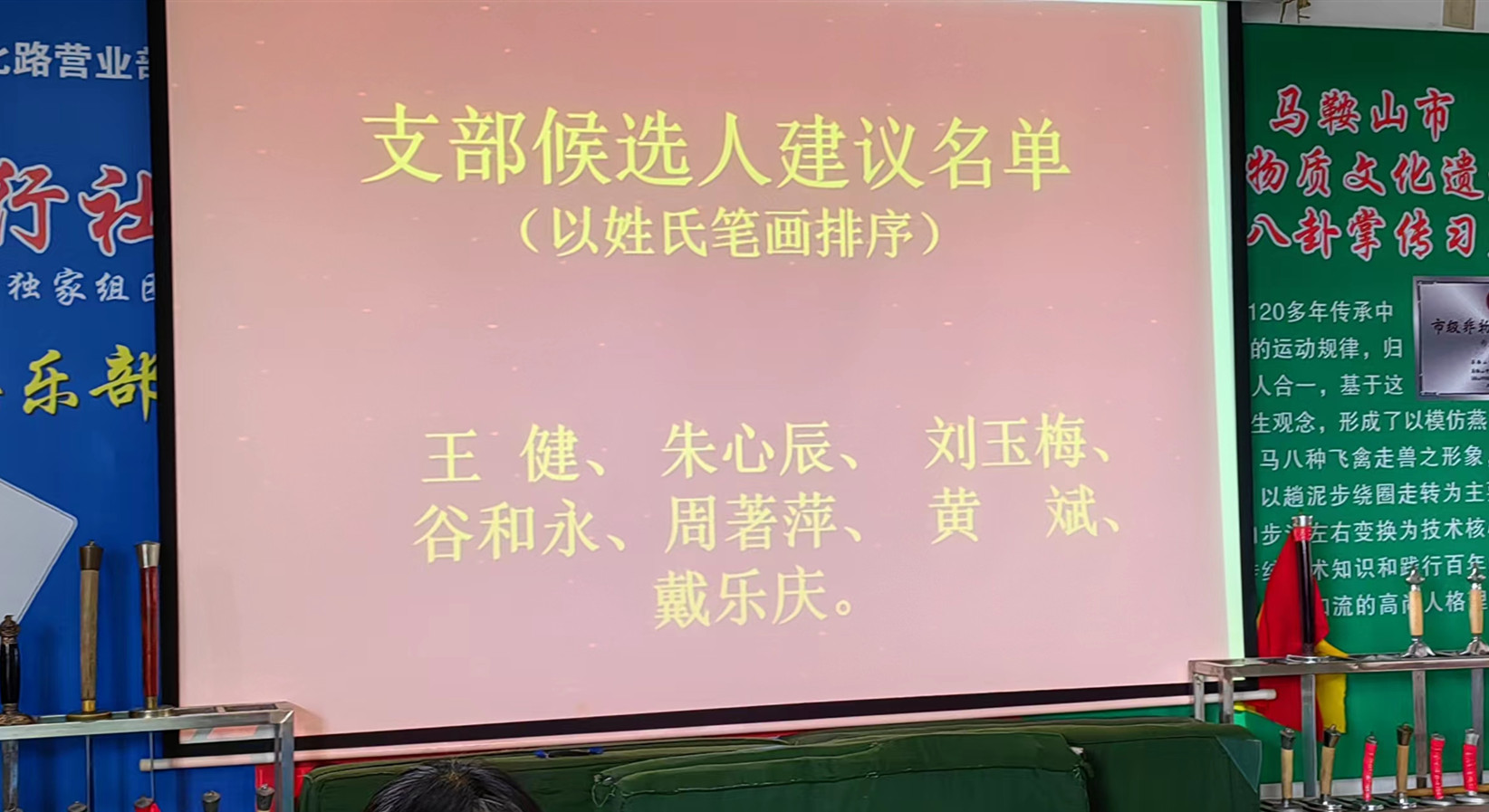 7月12号上午,马鞍山市武术协会管理层党员大会在武协办公大厅隆重召开。大会由党支部书记谷和永主持。谷和永书记宣读:中共马鞍山市社会组织综合委员会(民政局党委)《关于同意成立马鞍山市武术协会功能性党支部的批复》。大会由周著萍同志介绍关于马鞍山市武术协会功能性党支部的筹备工作;谷和永同志提出支部委员候选人名单;由王秋季、张建华老师负责计票、监票;并按规定进行选举,计票人向支部书记汇报选举结果:支委会由王健、朱心辰、刘玉梅、谷和永、周著萍、黄斌、戴乐庆七人组成。