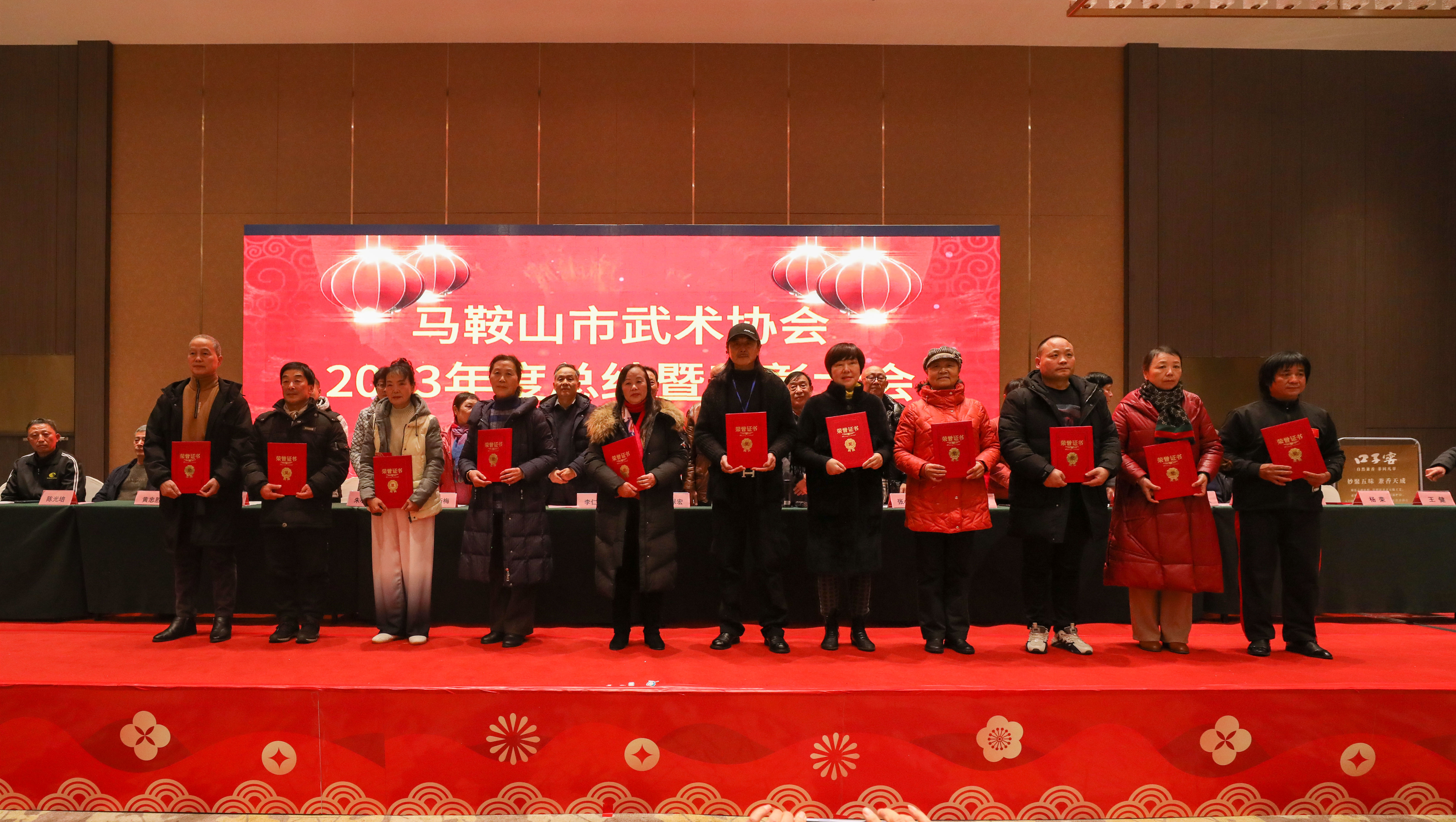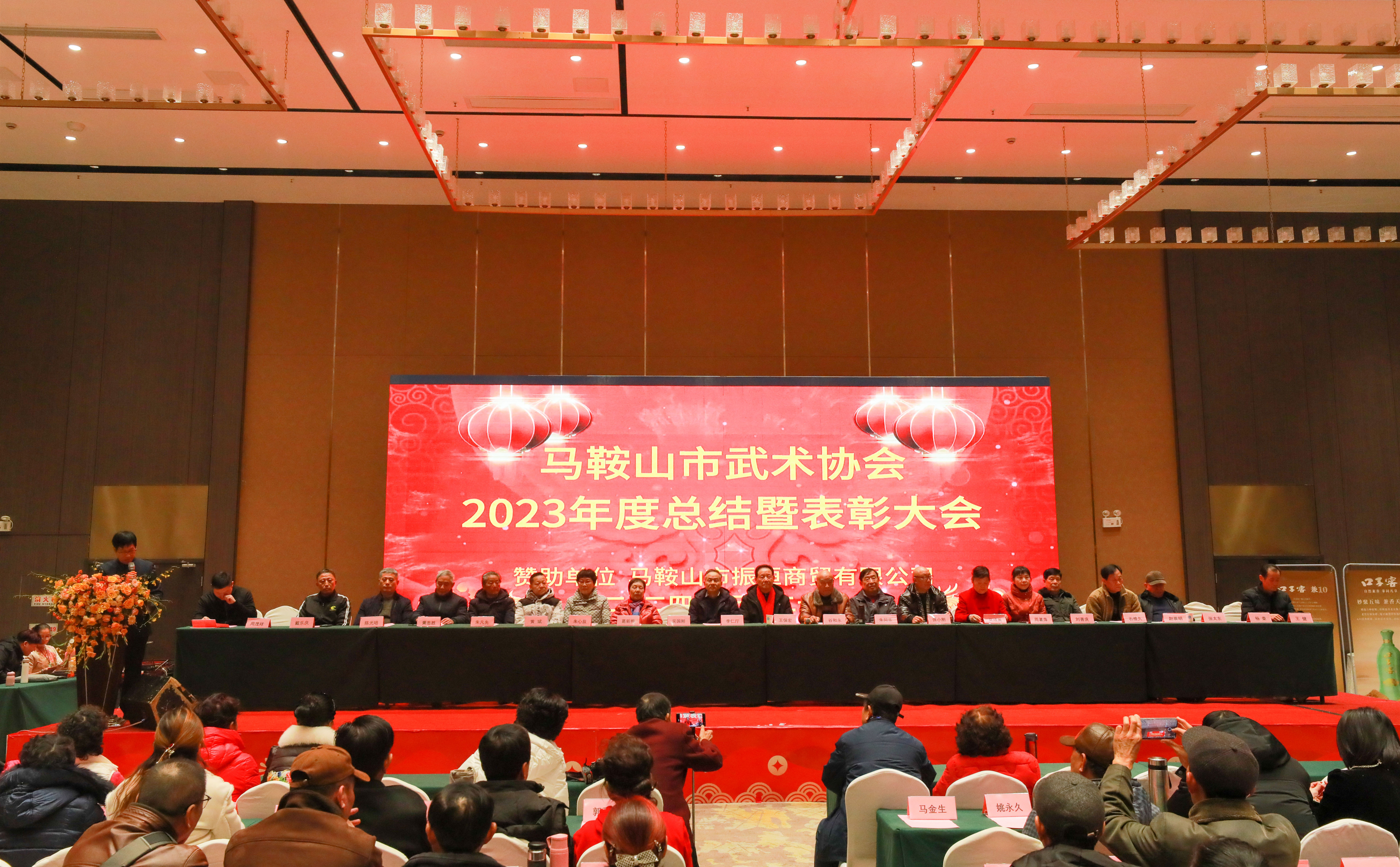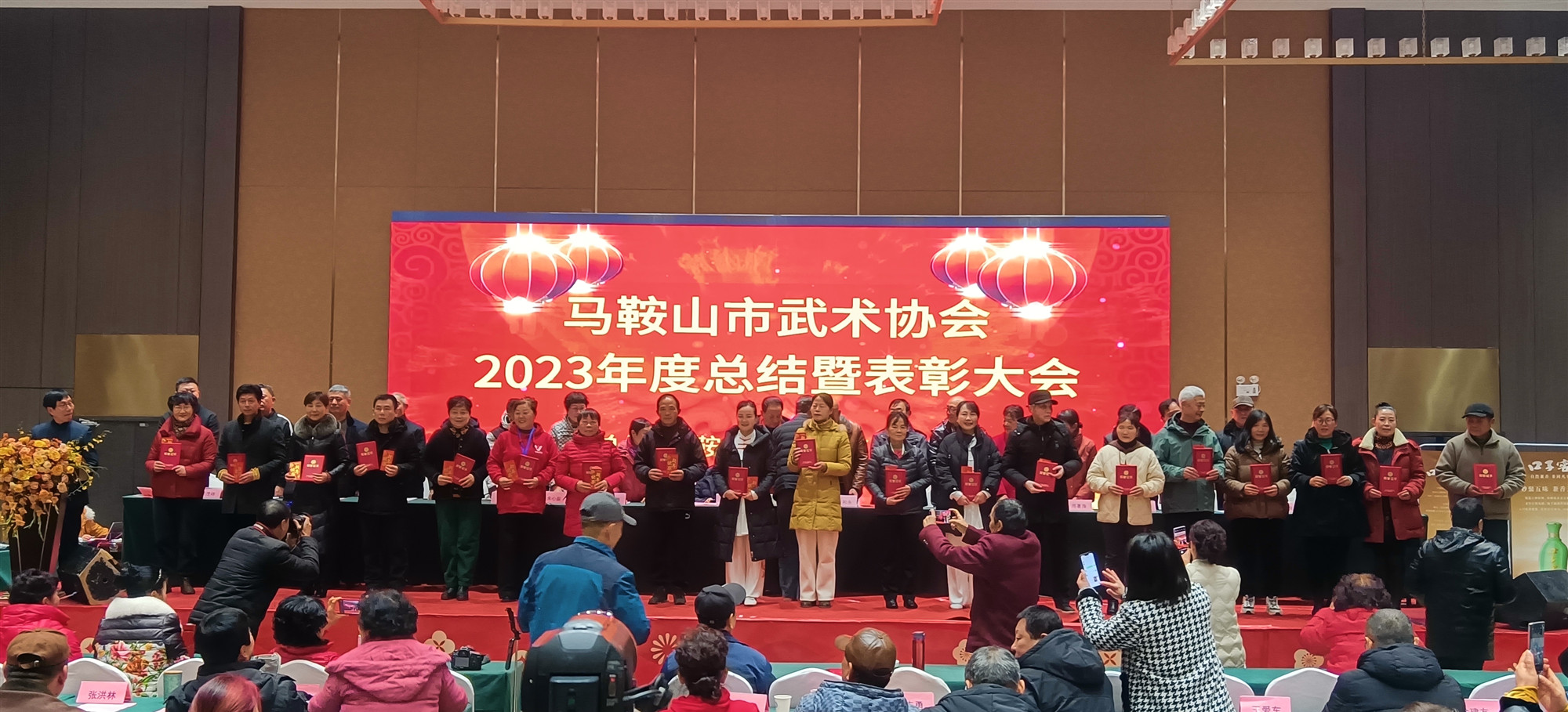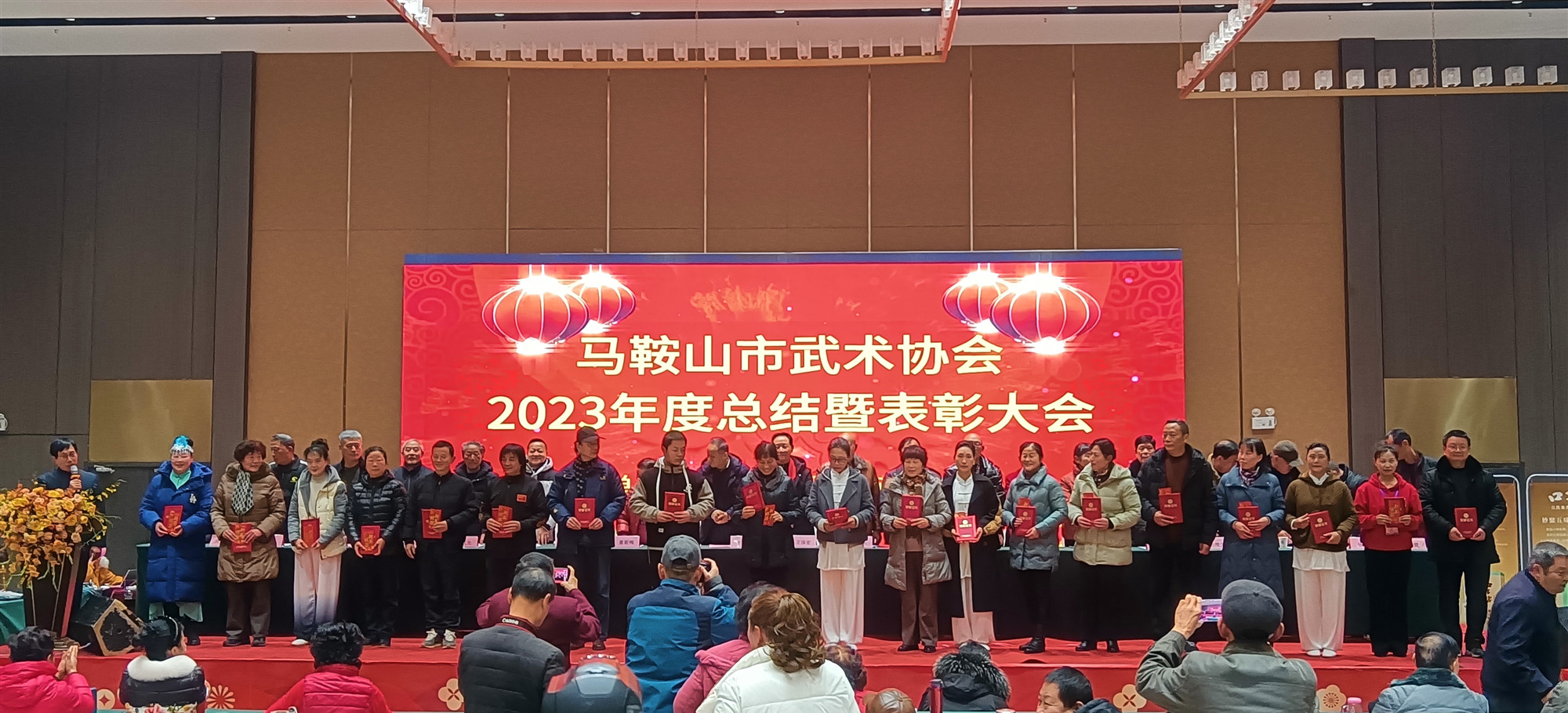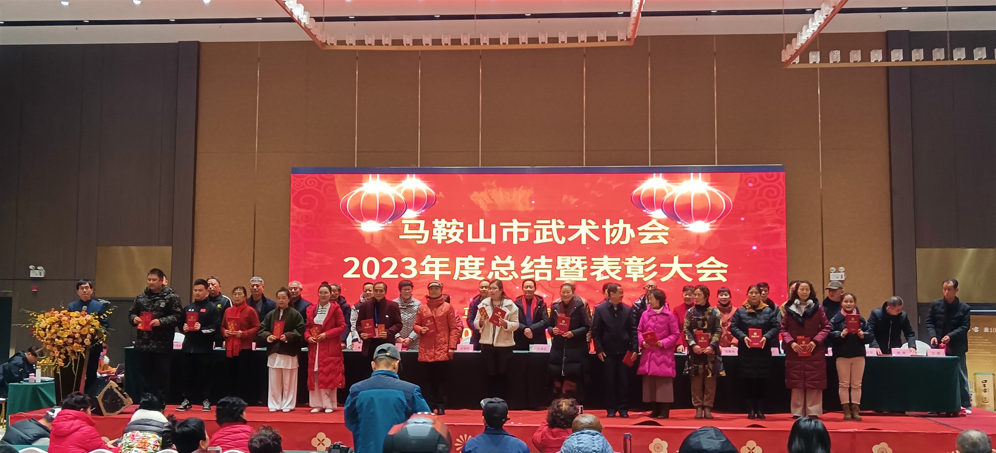 •  元月20日下午,马鞍山市武术协会在市薇拉微汀酒店举行了2023年度总结表彰大会。来自三区三县及全体理事会成员和各俱乐部代表共500余人参加了大会。会议由市武术协会副会长、秘书长吴国刚主持。市武术协会会长谷和永为大会做了2023年工作报告,并宣布受聘领导任命文件并颁发聘书,常务副会长张小刚宣读《关于2023年市武术协会先进集体、先进个人、特别贡献奖表彰决定》,主席台上领导分别为10个先进集体,118名先进个人,1名特殊贡献奖颁发奖状和奖金,并为2022年评选的5位武术名人颁发名人证书,获得全场人员掌声祝贺。