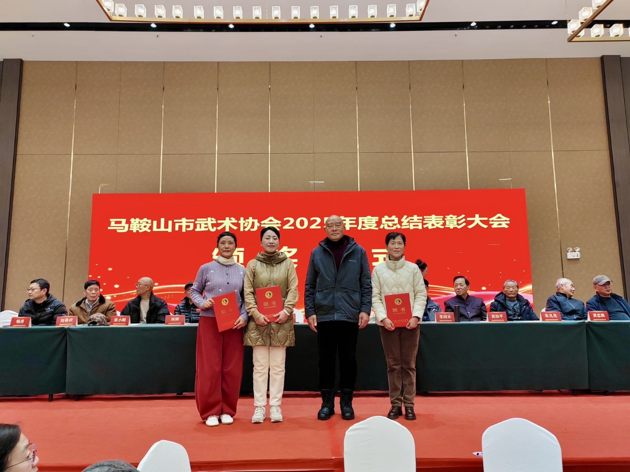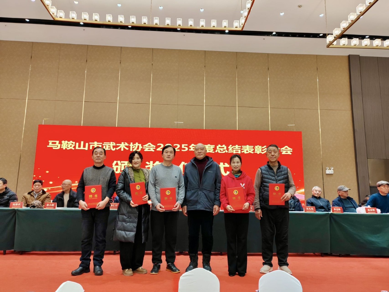 马鞍山市武术协会副会长兼雨山区武术协会会长:葛新梅、市武术协会副会长兼花山区武术协会会长:吴成英、市武术协会副会长兼当涂县武术协会会长:杨守祥、市武术协会副会长兼和县武术协会会长:张太东、市武术协会副会长兼含山县武木协会会长:王立明、市武术协会副会长:戴乐庆、周著萍、朱心辰、王健等,以及106位理事成员出席了大会。